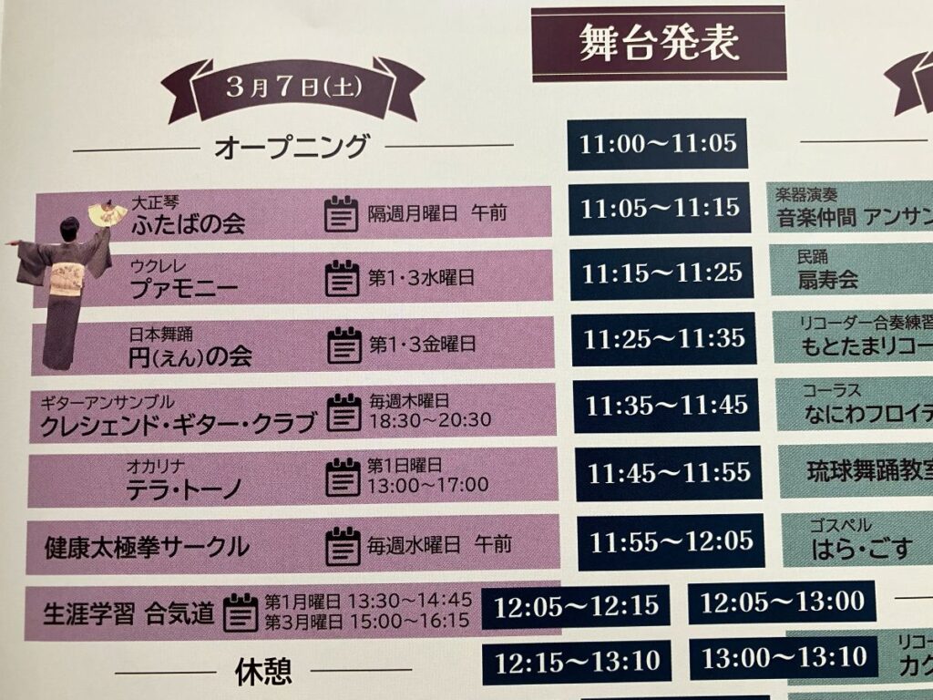 です。ほかの舞台発表、作品の展示、お茶席など、日ごろ阿倍野学習センターで活動している皆さんの発表の場です。